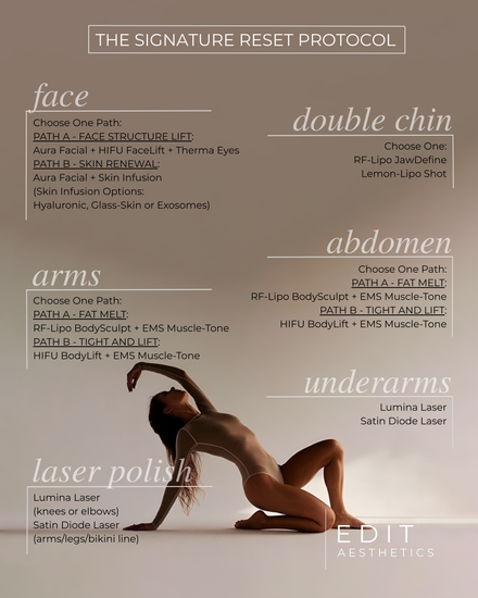 A single-session, high-impact transformation designed for clients who want visible improvement in one visit. The Signature Reset layers carefully selected face, body, and skin Edits by anatomical area - delivering lift, sculpting, brightening, and refinement with precise sequencing and minimal downtime.